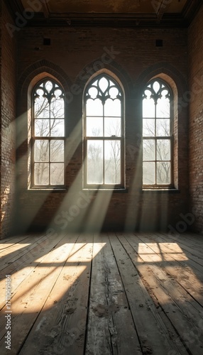 Sunlight streams through gothic windows into old room. Beams create patterns on wooden floor, brick walls. Space evokes history, decay, solitude in aged building interior. Light plays in derelict