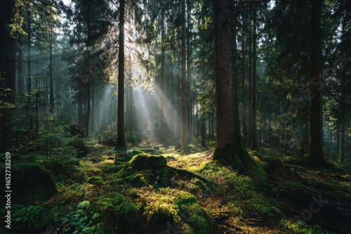 Sunlight Streams Through Tall Trees in Lush Green Forest Landscape with Mossy Ground and Misty Atmosphere