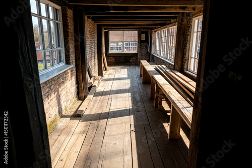 Sunlight streams through windows in an empty workshop with wooden benches and tools in a quiet building
