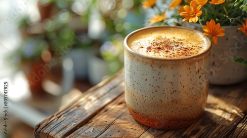 Sunlit almond milk latte, velvety foam, on rustic wood, morning dew visible