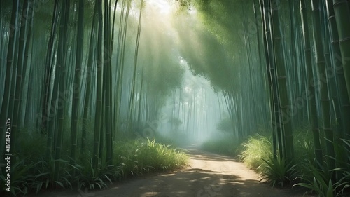 bamboo forest, sunlit, path, nature, greenery, serene, tranquil, morning light, misty, dense forest, natural beauty, outdoors, scenic, peaceful, lush, foliage, landscape, environmental, wilderness