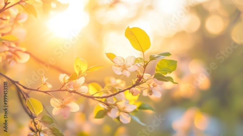 flower, nature, bloom, spring, blossom, tree, tree branch, sunshine, light, gold, yellow, green, white, soft, delicate, beautiful, natural, flora, garden, outdoors, fresh, vibrant, fragile, pastel, foliage, blooming, botany, plant, organic, growth, life, dawn, morning, sunbeam, peaceful, background, aesthetic