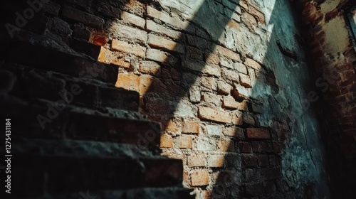 brick, wall, stair, light, shadow, texture, architecture, building, old, vintage, aged, rustic, stone, masonry, decay, grunge, dark, contrast, detail, pattern, design, background, construction, historical, heritage, urban, structure, surface, material, crumbling, weathered, worn, oblique, sunlight, ray, shade, aesthetic, photograph, image