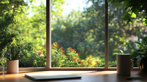 window, sunlight, desk, garden, green, plant, nature, view, workspace, office, home, room, table, mug, notebook, paper, leaf, tree, foliage, bright, light, day, summer, spring, peaceful, calm, serene, relaxing, cosy, comfort, interior, design, wood, white, red, flower, bloom, morning