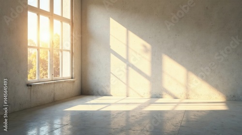 Sunlit Empty Room with Concrete Walls and Large Window Showing Shadow Patterns on the Floor