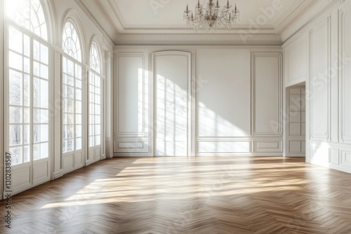 room, interior, empty, hardwood, floor, window, sunlight, sunbeam, light, classic, elegant, white, wall, panel, molding, arch, french, door, roomy, luxury, design, home, house, apartment, real estate, architecture, building, style, decor, bright, clean, modern, contemporary, vintage, antique, palace, luxury home, grand, large, herringbone, wooden, ceiling, chandelier, ornate