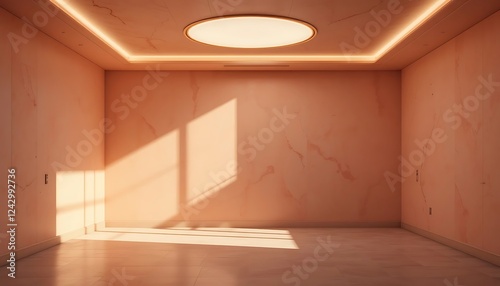 room, empty, peach, wall, lighting, modern, sunlit, sunlight, shadow, interior, design, minimalist, contemporary, architecture, space, clean, bright, calm, serene, peaceful, tranquil, relaxing, home, house, apartment, condo, building, structure, ceiling, floor, light, illumination, marble, texture, corner, baseboard, neutral, simple, elegant, sophisticated
