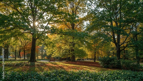 Sunlit forest area in a city park showcasing autumn foliage and greenery