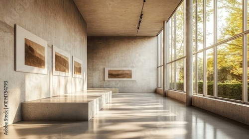 gallery, art, museum, interior, architecture, design, modern, minimalism, sunlight, light, window, landscape, painting, artwork, frame, wall, concrete, floor, space, exhibition, building, room, hallway, display, exhibit, visual, art, contemporary, peaceful, serene, tranquil, calm, aesthetic, bright, illuminated, picture, image, photo, still, life