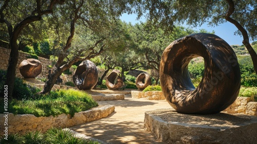 garden, path, sculpture, wood, art, nature, outdoors, landscape, sunny, tree, summer, stone, design, park, paseo, sunlight, green, plant, environment, scenery, beauty, calmness, serenity, peace, calm, relaxation, picturesque, aesthetic, artistic, creative, organic, natural, texture, detail, shadow, light, form, shape, curve, round, hollow, brown, earth, tone