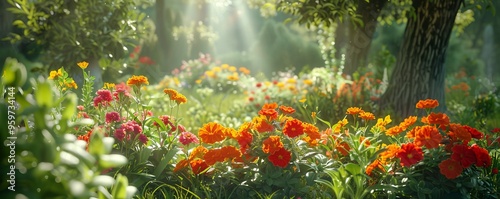 Sunlit garden with colorful petunias and marigolds, 4K hyperrealistic photo