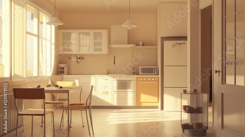 kitchen, apartment, sunlight, room, interior, design, home, cosy, morning, serene, calm, peaceful, bright, warm, yellow, beige, white, table, chair, window, sunbeam, light, furniture, minimalist, modern, decor, house, space, domestic, residential, habitation, living, dwelling, comfort, relaxation, ambience, atmosphere, style, aesthetic, vintage