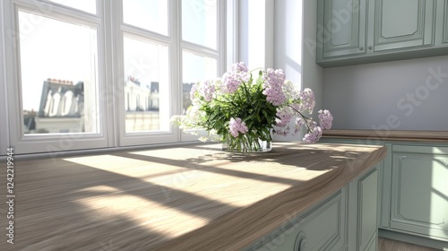 kitchen, flower, window, sunlight, counter, vase, light, interior, room, home, design, decor, style, spring, summer, blossom, bloom, plant, pastel, pink, green, wood, cabinet, furniture, apartment, house, city, view, bright, clean, fresh, modern, rustic, elegant, serene, peaceful, beauty, nature, cosy, day, sunny, warm, soft, aesthetic, lifestyle