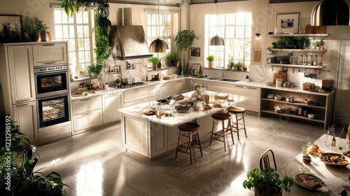 kitchen, interior, design, home, cooking, food, island, oven, cabinet, countertop, appliance, style, modern, contemporary, rustic, farmhouse, elegant, luxury, roomy, bright, light, airy, window, plant, greenery, decor, furniture, shelf, storage, breakfast, bar, stool, dinner, table, room, area, house, warm, sun, sunlight, ambience, comfortable, beautiful, clean, aesthetic