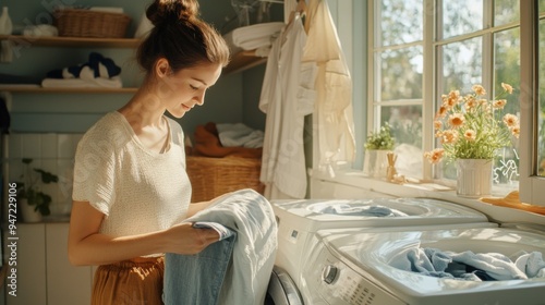 Sunlit Laundry Day: A young woman gently folds laundry in a cozy sun-drenched laundry room, embracing the simple joys of a domestic moment.