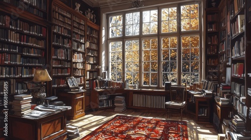 library, bookshelf, book, reading, room, interior, window, sun, light, sunlight, wood, furniture, vintage, classical, cosy, shelf, desk, chair, floor, carpet, rug, cognition, literature, education, study, classic, old, brown, antique, historical, architecture, elegant, dark, warm, gold, gold, illuminated, bright, traditional