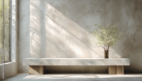 minimalist, room, sunlit, marble, bench, wooden, leg, beige, wall, textured, glasses, vase, branch, flowering, sunlight, shadow, light, airy, calm, serene, peaceful, quiet, tranquil, roomy, interior, design, modern, contemporary, clean, simple, elegant, sophisticated, natural, organic, botany, bloom, spring, plant, greenery, decor, style, aesthetic, home, house, apartment, space, bright, neutral