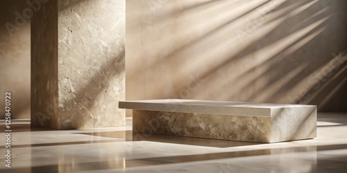 stone, platform, display, minimalist, sunlit, sunlight, shadow, texture, wall, beige, neutral, earth-tone, interior, modern, design, background, product, presentation, architecture, contemporary