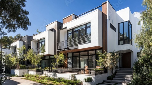 Sunlit modern townhouse with crisp white walls and metal accents, nestled in an urban setting