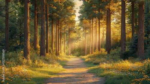 path, forest, tree, sun, sunlight, nature, wood, summer, spring, landscape, scenery, pathway, trail, walk, green, light, gold, ray, beam, flora, flower, plant, wildflower, meadow, foliage, tranquil, peaceful, serene, calm, beauty, scenic, environment, ecosystem, ecology, vibrant, bright, idylli, picturesque, majestic, magical, dreamy, romantic, inspirational, adventure, exploration