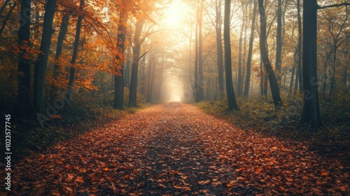 forest, path, tree, sunlight, fog, autumn, leaf, orange, brown, red, green, nature, timberland, misty, gold, wood, landscape, scenic, season, fall, branch, canopy, glow, light, sunbeam, hazy, silhouette, moody, atmosphere, tranquil, peaceful, beauty, magic, mystery, wanderlust, explore, escape