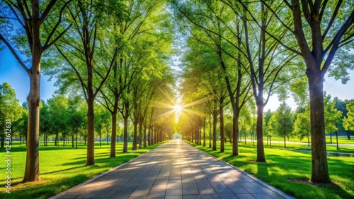 Sunlit Pathway Through Lush Green Trees in a Tranquil Park