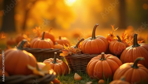 Sunlit pumpkins and gourds overflowing from baskets, rich colors, rustic setting