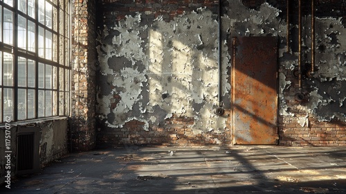 room, brick, building, derelict, abandoned, industrial, factory, grunge, texture, wall, peeling, paint, floor, window, rust-eaten, metal, door, sun, light, shadow, pipe, decay, weathered, aged, old, dilapidated, interior, space, empty, desolate, dark, concrete, dust, debris, structure, architecture, urban, scene, background, vintage, retro