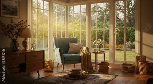 Sunlit Room with Large Windows and a Comfortable Reading Nook