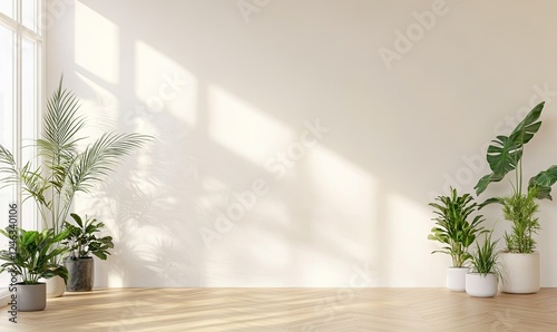 Sunlit room with plants, blank wall, wood floor, ideal for product placement or backgrounds