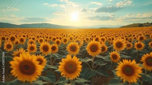 Sunlit sunflower field at sunset, vast landscape with mountains in the background.