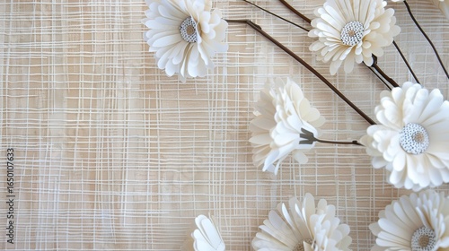Sunlit textured wallpaper decorated with delicate white paper flowers, featuring intricate textures and bright sunlight that enhances the floral patterns. The charming design adds elegance to interior