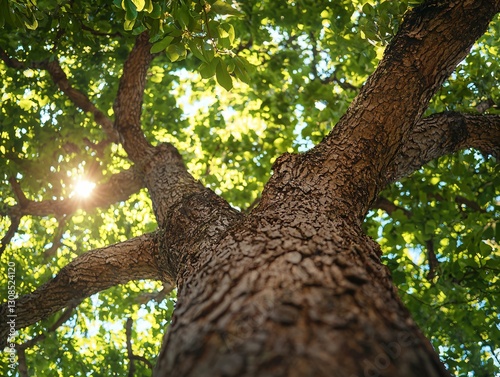 tree, trunk, bark, leaf, sun, sunlight, summer, nature, green, foliage, branch, outdoors, environment, ecosystem, forest, wood, park, garden, spring, light, shadow, texture, background, botany, growth, wood, flora, plant, detail, closeup, scenic, landscape, natural, vibrant, bright, healthy, strong, majestic, peaceful, serenity, calmness, low angle, perspective, looking up