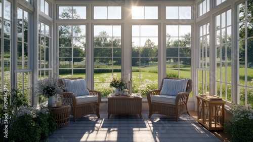 Sunlit wicker chairs and a table in a sunroom with large windows overlooking a green meadow.