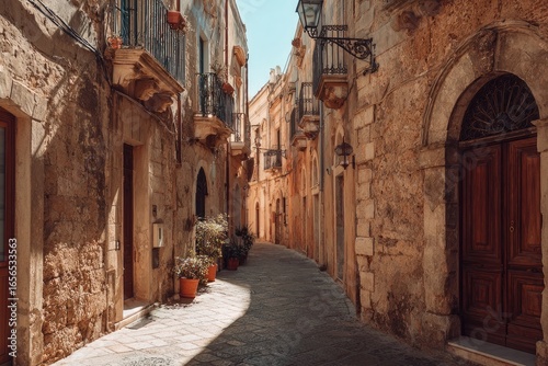 alley, sunny, narrow, town, stone, building, ancient, old, italian, charming, europa, street, path, architecture, facades, mediaeval, terracotta, brown, warm, light, shadow, vintage, rustic, historic, travel, tour tourism, vacation, door, window, balcony, plant, pot, cobblestone, paved, perspective, depth, detail, exterior, sunlight, warmth, beautiful, scenic, photogenic, destination