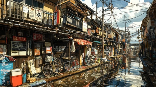 Sunny canal-side street, Japan; bustling shops, bikes, reflections; travel, tourism