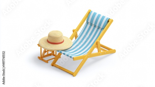 Sunny Day 3D Icon of Sun Hat and Beach Chair Isolated on White Background