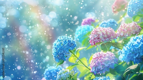 rainbow, blue skies, blue skies, hydrangea, animation, flower, rainy season, plant, nature, landscape, june, summer, background, flower petals, japan, copy space, illustration, blue, rain, full bloom, cloud, sky blue, thunderhead, view, panorama, banner, purple, field, meadow, grass, ai, freshness, flower head, fragility, abundance, decorating, growth, elegance, comfortable, sunlight, strength, rainforest, progress, evolution, discovery, aspiration