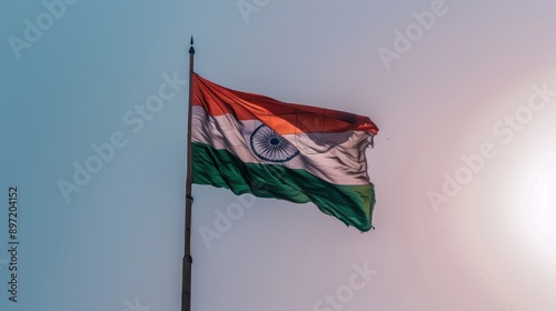 Sunny day with the indian flag waving in the wind, displaying the colors of saffron, white, and green