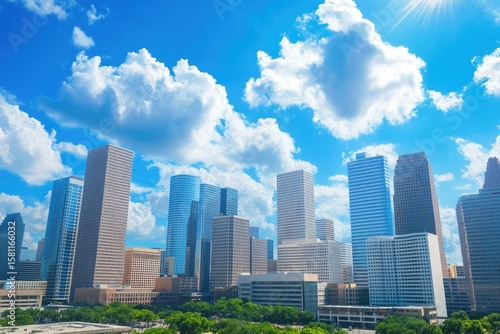 city, skyline, building, skyscraper, cloud, blue, sky, sun, houston, texas, urban, modern, architecture, business, commerce, panorama, view, aerial, daylight, bright, sunny, summer, exterior, landscape, contemporary, commercial, metropolis, tower block, concrete, glasses, steel, structure, urbanisation, development, growth, economy, capital, modernity, progress, business district, horizon, perspective, elevation, outlook, sunshine, wide, photo, image