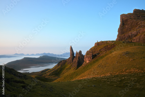 Sunny landscape with the high sharp cliffs towering over the lake and the sea in the morning and small figures of people. The Old Man of Storr, The Isle of Skye, Scotland, UK