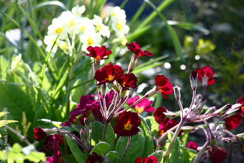 Sunny spring day. In a flower bed different primroses plentifully blossom. Different inflorescences, different colors.