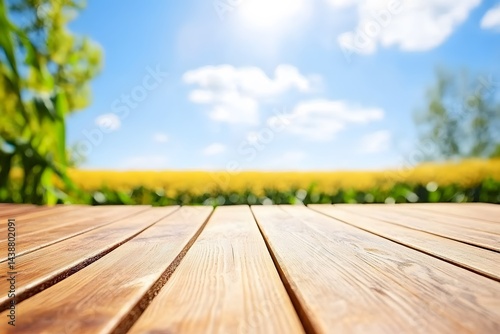 Sunny Summer Day Wooden Tabletop Background with Yellow Field