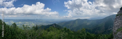 Sunny summer hiking path in the mountains. Rocky Mountain in the summer with trees and forest. Walking in the mountains and forest with blue sky. Summer travel hiking in Europe.