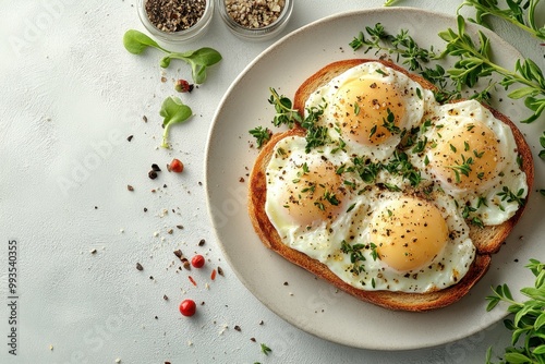 Sunny Toast. Fried eggs sunny side up on toast with herbs and spices b