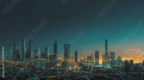 sunrise Aerial view of Smart digital Innovation city with connection network reciprocity over the cityscape. of future smart wireless digital city and social media networking systems that connects