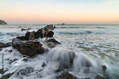 asturias, atlantic, bay, beach, blue, cliff, coast, colours, dawn, foam, fresh, landscape, nature, ocean, power, rock, sand, sea, seascape, shore, sky, spain, splash, spray, stone, strong, sunrise, sunset, travel, water, wave, weather