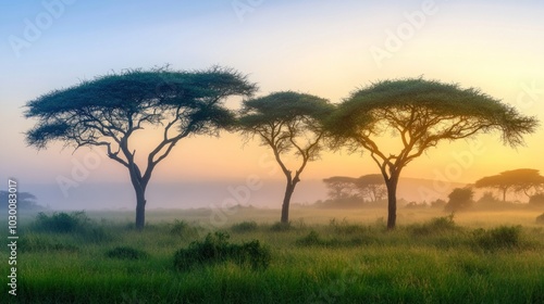 tree, savanna, grass, sunrise, sunset, sky, horizon, nature, africa, wildlife, landscape, gold, hours, morning, light, sun, field, tropical, warm, colours, green, yellow, orange, blue, mist, fog, silhouette, outdoors, beautiful, peaceful, serene, tranquil, calm, photo, travel, adventure, safari, wild, natural, bush, vegetation, flora, environment