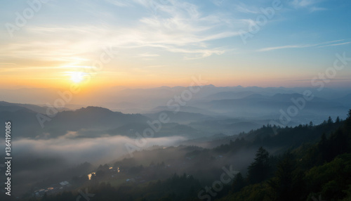 sunset, sky, mountain, landscape, nature, mountain, sunrise, cloud, cloud, fog, sun, blue, hill, mist, view, morning, forest, dawn, vale, misty, beauty, orange, horizon, dusk, hill