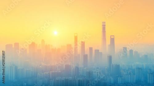 city landscape, sunrise, skyscraper, city, urban, metropolis, skyline, sun, golden hour, hazy, morning, dawn, calmness, peaceful, calm, serene, beautiful, majestic, architecture, building, light, ray, colours, vibrant, panoramic, view, aerial view, perspective, atmosphere, mood, soft light, dreamlike, gold, yellow, orange, blue, city landscape, building, sky, sunset, silhouette, skyscraper, illustration, vector, business, town